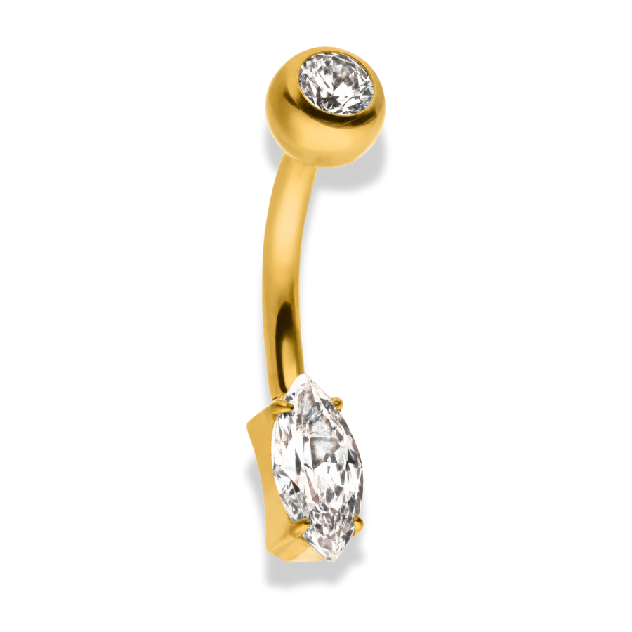 Dieses edle Bauchnabelpiercing besticht durch einen funkelnden Zirkonia-Stein im eleganten Marquise-Schliff. Der präzise Schliff sorgt für eine wunderschöne Lichtreflexion und verleiht dem Schmuckstück eine zeitlose, feminine Ausstrahlung – elegant, stilvoll und perfekt für besondere Momente oder den Alltag.