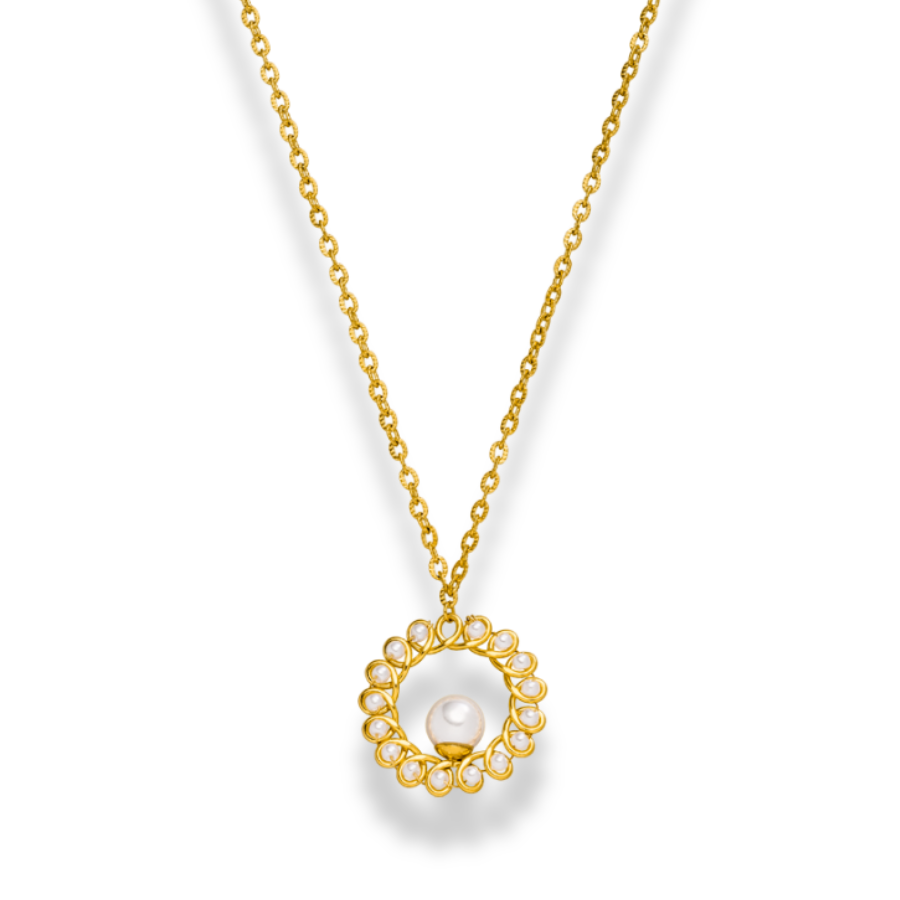 Die Golden Spiral Pearl Kette vereint raffinierte Eleganz mit feiner Handwerkskunst. Die zarte goldene Kette trägt einen Anhänger in runder Spiralform, der mit schimmernden Perlen besetzt ist und mittig von einer größeren Perle akzentuiert wird. Das Zusammenspiel von goldenen Glanz und sanftem Perlenschimmer verleiht der Kette eine luxuriöse Ausstrahlung und macht sie zu einem stilvollen Highlight für jeden Look.