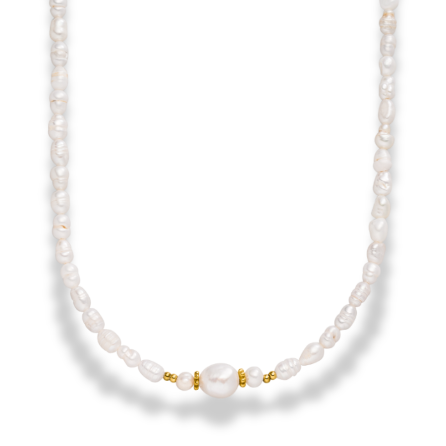 Die Aurora Pearl Kette vereint zeitlose Eleganz mit natürlichem Glanz. Sie besteht aus feinen Süßwasserzuchtperlen und wird mittig von einer größeren Perle geschmückt, die jeweils rechts und links von dezenten goldenen Perlen begleitet wird. Das harmonische Design lässt das natürliche Schimmern der Perlen besonders schön zur Geltung kommen und macht die Kette zu einem stilvollen Begleiter für jeden Anlass.