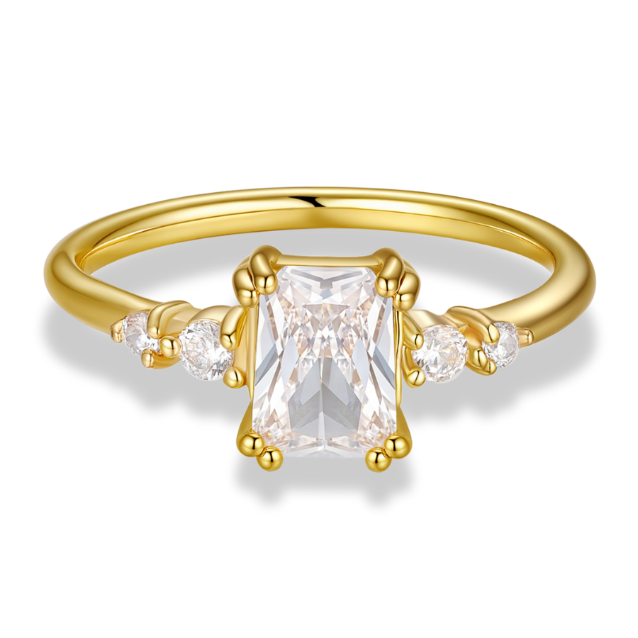 Der Baguette Glow Ring vereint minimalistisches Design mit luxuriösem Funkeln. Im Zentrum steht ein rechteckig geschliffener Zirkonia-Stein (Baguette-Cut), der von je zwei runden Zirkonia-Steinen flankiert wird. Die ausgewogene Anordnung bringt Eleganz und Leuchtkraft in perfekter Balance – veredelt mit einer warmen 14K Vergoldung.
