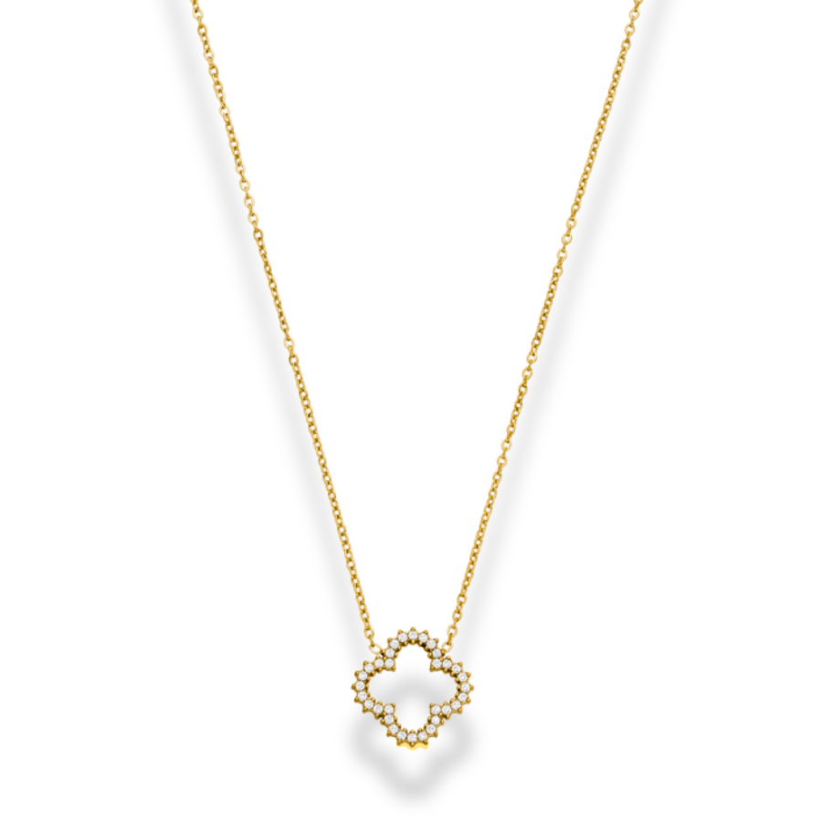 Die Framed Pave Leaf Kette vereint zarte Eleganz mit symbolischer Bedeutung. Ein Kleeblatt-Anhänger aus hochwertigen Zirkonia Steinen ist in einem feinen goldenen Rahmen gefasst und strahlt funkelnde Raffinesse aus.