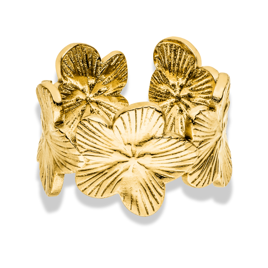 Der Golden Blossom Ring ist das ideale Schmuckstück für alle, die florale Formen lieben und ihren Stil mit einem Hauch tropischer Romantik verfeinern möchten – solo getragen oder als harmonisches Match zum Golden Blossom Armreif.