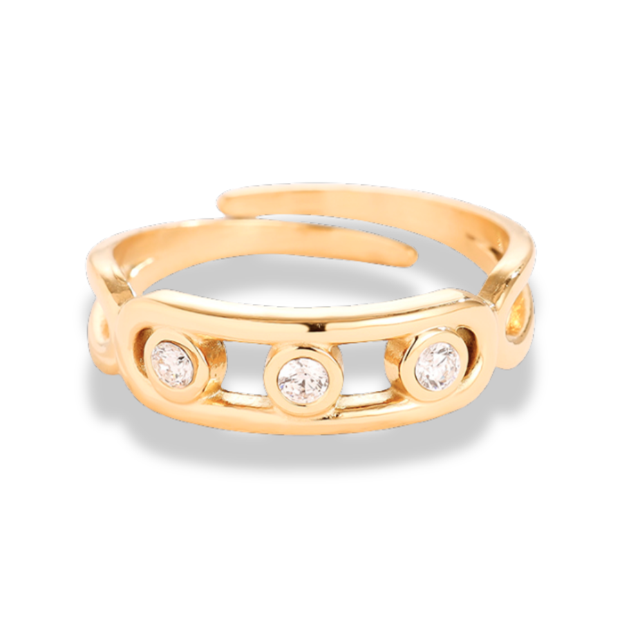 Die fest eingefassten Zirkonia-Steine sorgen für funkelnde Akzente und verleihen dem Ring eine zeitlose Ausstrahlung. Gefertigt aus hochwertigem, 18K vergoldetem Edelstahl, verbindet er Beständigkeit mit einem Hauch von Luxus.