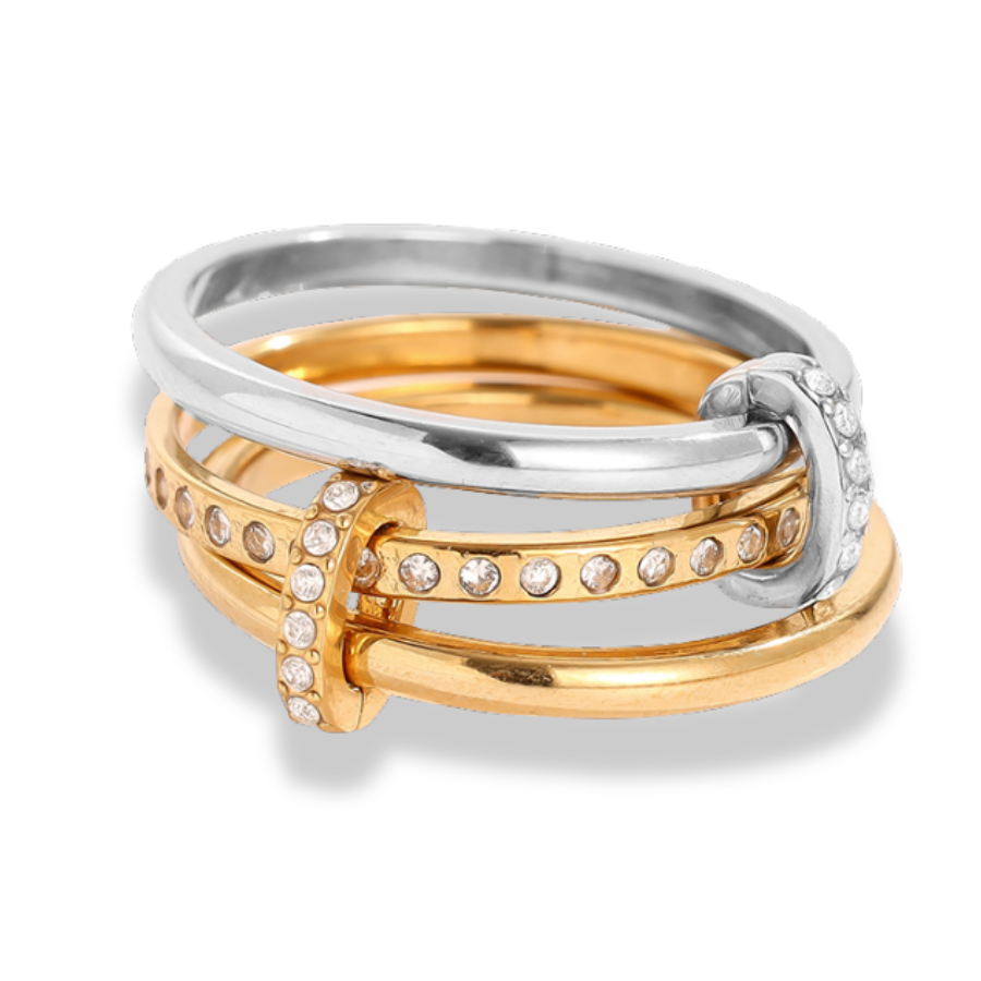 Zeitlose Eleganz in dreifacher Harmonie. Der Triple Pave Infinity Ring vereint drei fein aufeinander abgestimmte Ringe zu einem ausdrucksstarken Design. Außen liegen ein schlichter goldener und ein silberner Ring, simple in ihrer Form und dennoch zeitlos elegant. In der Mitte strahlt ein goldener Ring, der mit funkelnden Zirkonia Steinen besetzt ist und dem Design einen luxuriösen Akzent verleiht.