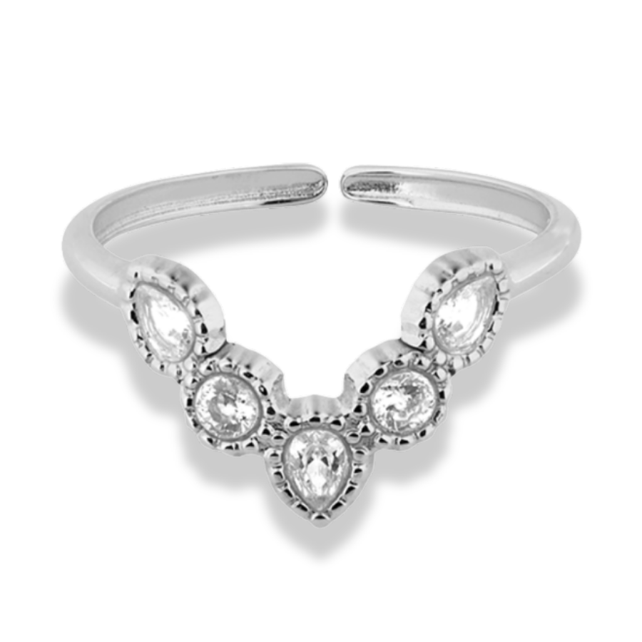 Der Calm Crystal Majestic Ring vereint königliche Eleganz mit moderner Leichtigkeit. Die offene, verstellbare Form wird im vorderen Bereich von fünf funkelnden Zirkonia-Steinen geschmückt, die in einer harmonischen Anordnung eingefasst sind. Unterschiedliche Steinformen sorgen für ein lebendiges Lichtspiel und verleihen dem Ring eine besonders edle, majestätische Ausstrahlung.