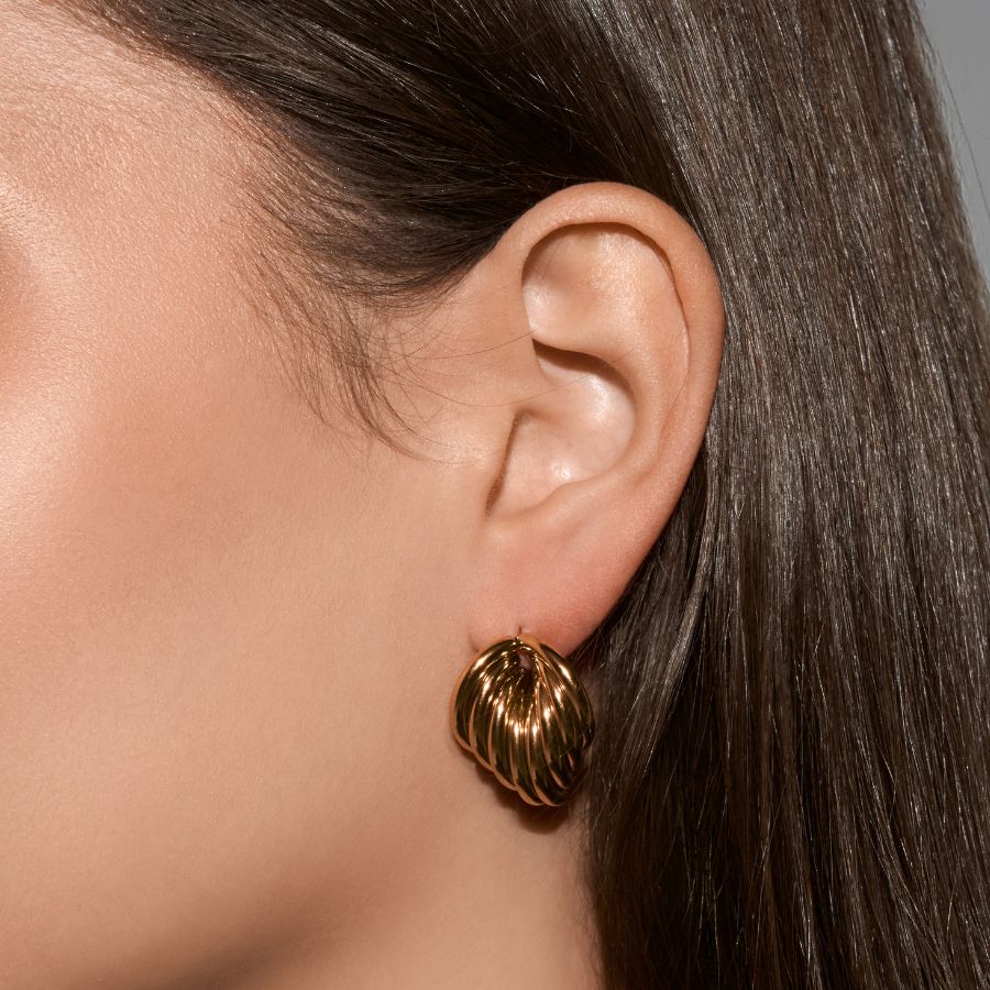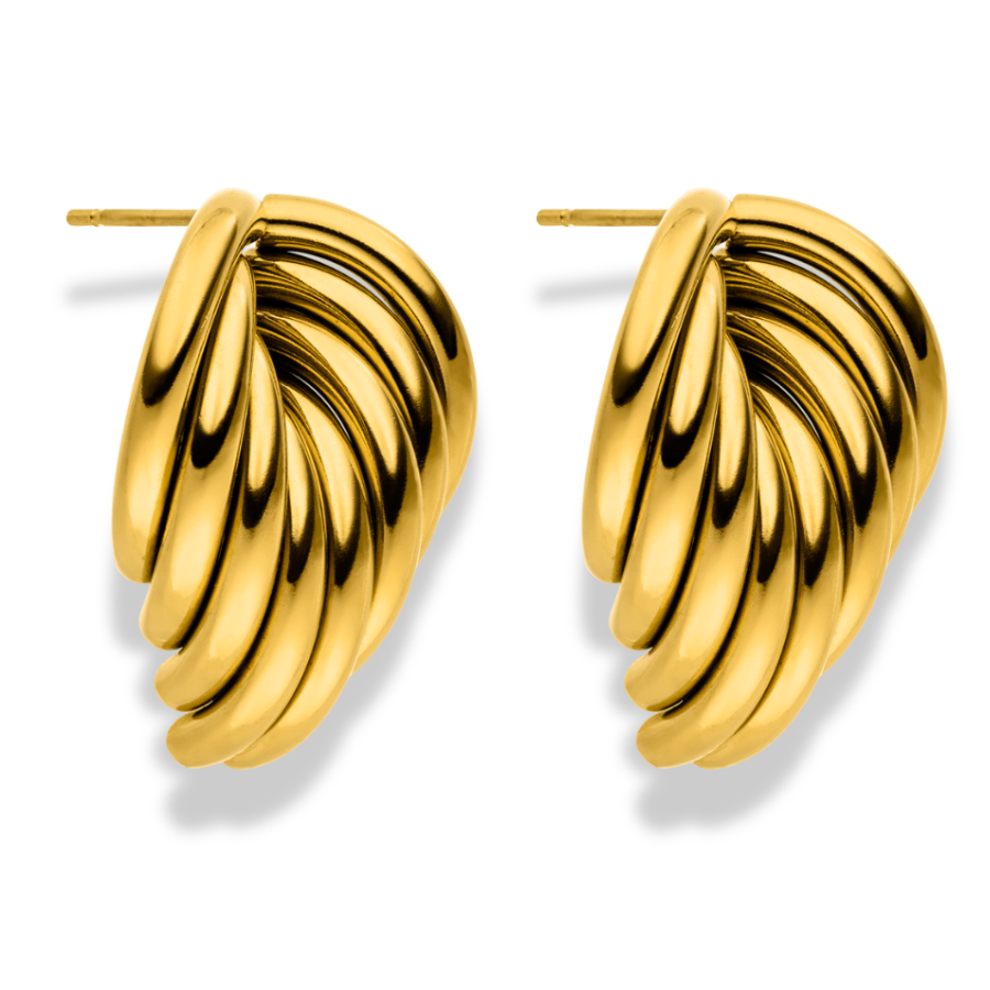 An artful interplay of nature and elegance. The Bold Golden Leaves earrings consist of four curved, gold-colored strands that unite to form a stylized leaf shape. The exceptional design is eye-catching yet remains classic and timeless. A piece of jewelry that perfectly combines modernity and inspiration from nature.