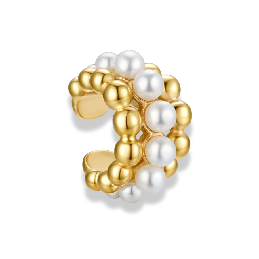 The Bold Golden Pearl Earcuff combines striking design with timeless elegance. Three delicate rows merge into a harmonious whole: two outer rows of gleaming golden beads, while the middle row consists of shimmering pearls. The interplay of warm gold and soft pearl shimmer gives this piece of jewelry a sophisticated radiance that is both modern and classic.