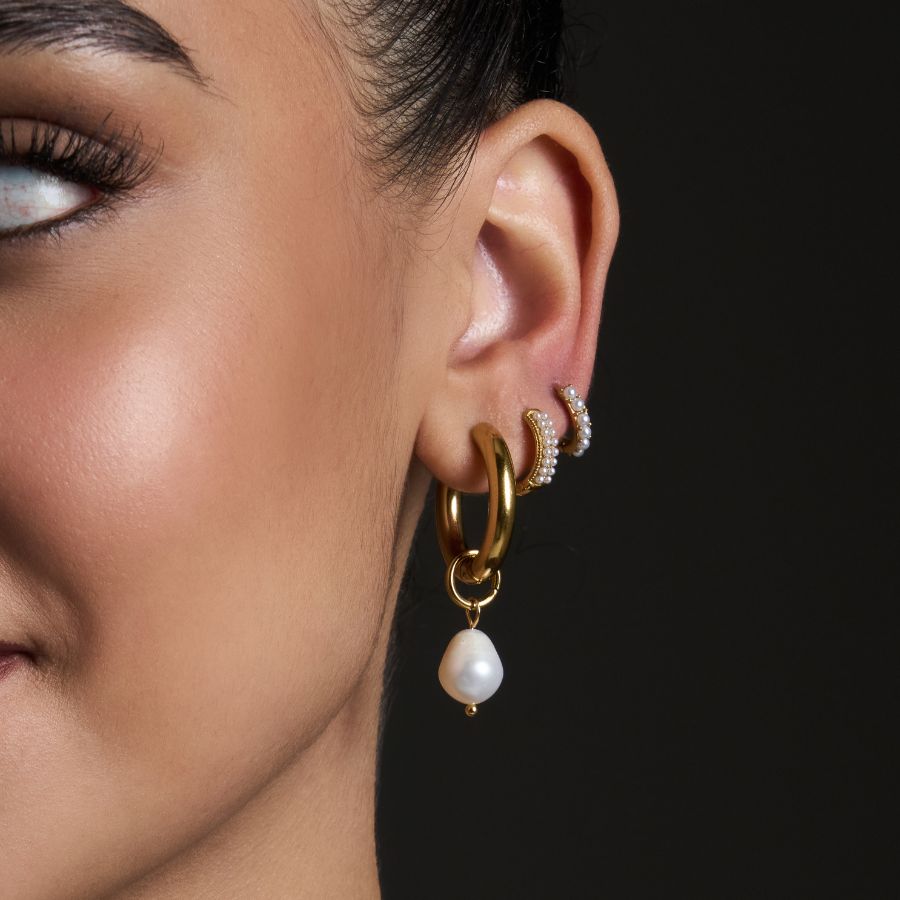A true statement piece: TheBold Pearl Huggie earringscombine clean lines with the timeless elegance of pearls. Made from high-qualityMade of stainless steel and plated with elegant 14K gold, they impress with their durability and luxurious shine.