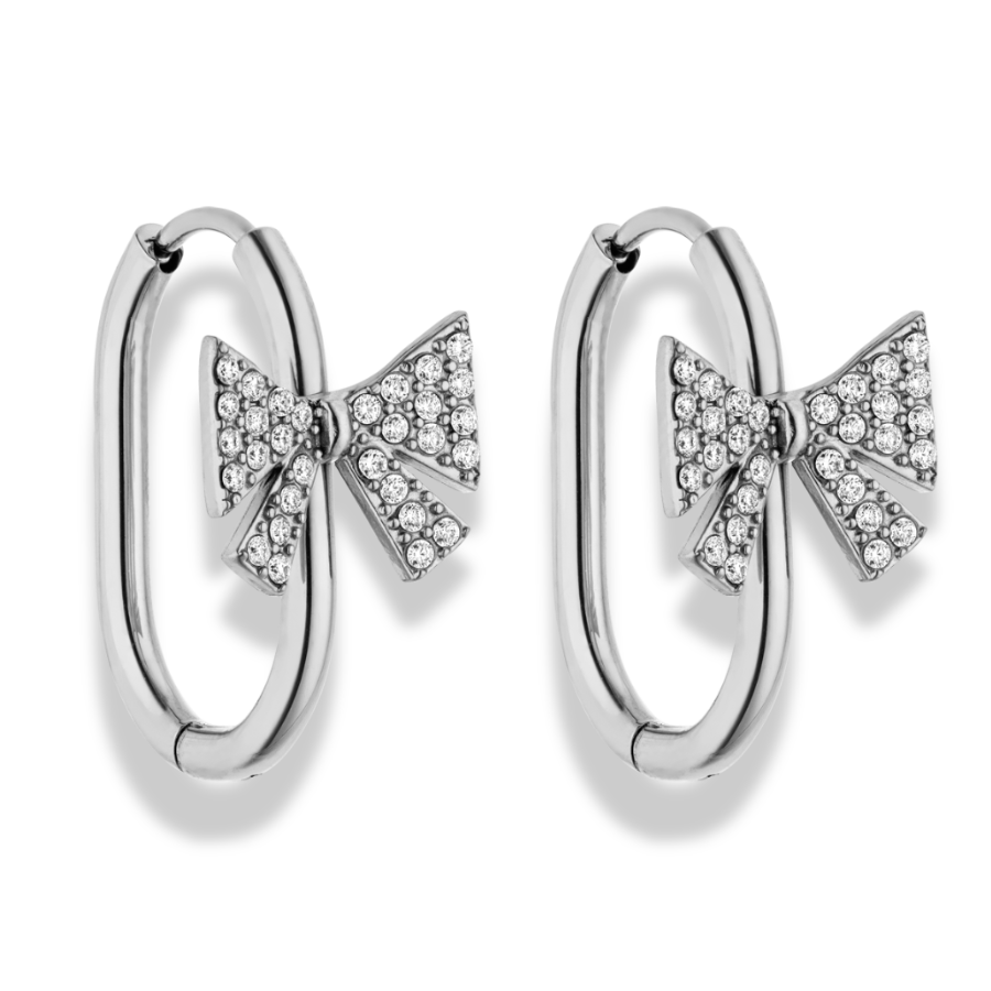 The Oval Ribbon Huggie Hoops combine feminine lightness with timeless sophistication. The oval huggie earring is adorned at the top with a delicate bow set with cubic zirconia stones – a detail that lends the earrings a special charm.