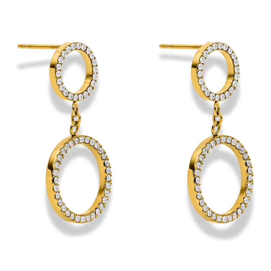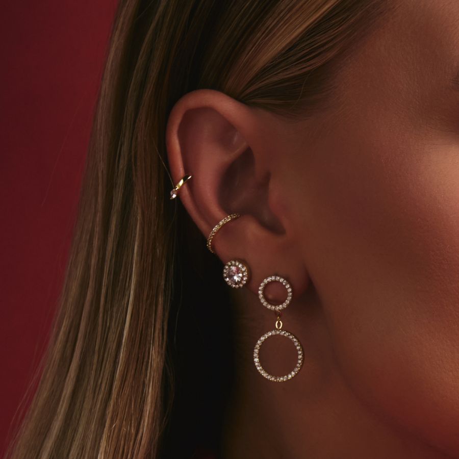 The Pave Double Karma stud earrings – a glamorous interplay of sparkling elegance and modern design. Two overlapping circles, connected by a delicate chain, create a sophisticated silhouette: the smaller upper circle rests discreetly on the ear, while the larger, movable circle sways gently with every movement. Both circles are set with radiant cubic zirconia stones, providing a luxurious sparkle and adding a touch of glamour to any look.