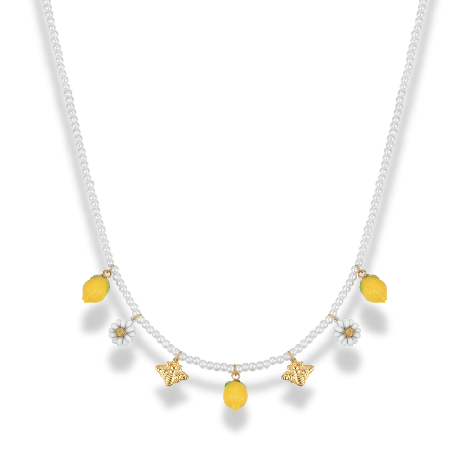 The Pearl Lemon & Bee necklace combines delicate elegance with a cheerful design. Finely crafted resin lemon pendants meet a small, golden bee – a meticulously detailed duo reminiscent of warm summer days. The design is rounded off by shimmering pearls that lend the necklace a touch of classic sophistication.