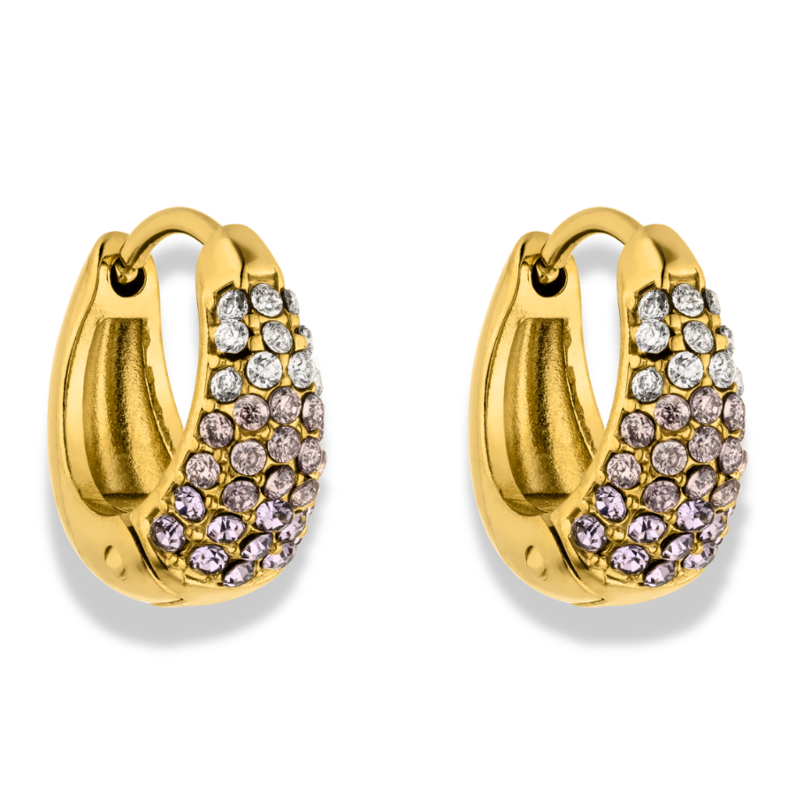 Modern and unique: The Wide Ombre Violet Huggie Hoops are distinguished by their special shape. Narrow at the top, widening towards the bottom. Sparkling cubic zirconia stones in a soft ombré color gradient from clear white to delicate violet give the hoop earrings an exceptional shine and a sophisticated color accent. Product features:
