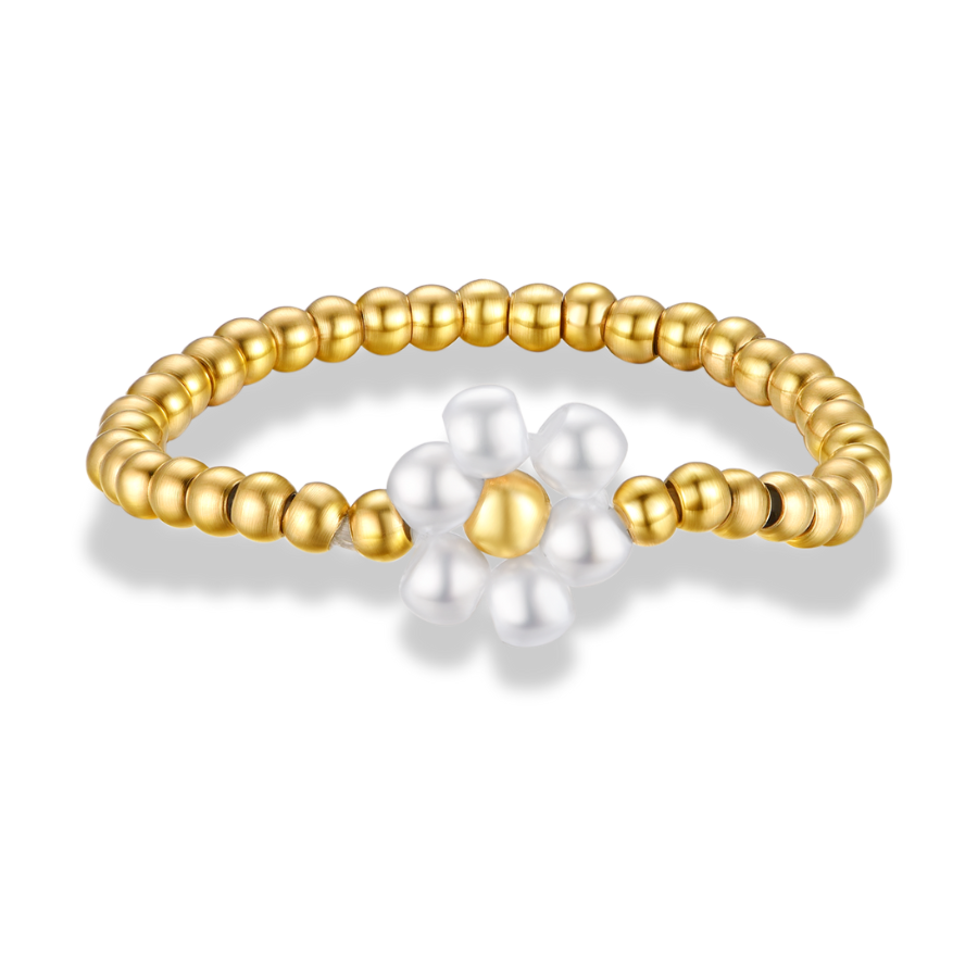 The Majestic Flower Ring combines playful lightness with elegant design. It is an elastic ring crafted from gold and white pearls. The ring is made of gold pearls and features a delicate white pearl flower as its central highlight.