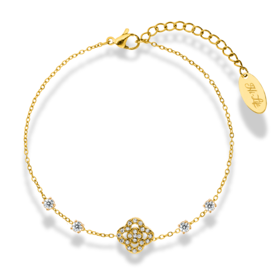 Dieses filigrane Armband begeistert mit einem femininen, zeitlosen Design. Im Mittelpunkt steht eine doppelte, kleeblattförmige Blüte, die für elegante Symbolik und funkelnde Raffinesse steht. Rechts und links der Blüte setzen jeweils zwei strahlende Zirkonia-Steine dezente Glanzpunkte und verleihen dem Armband eine harmonische Balance.