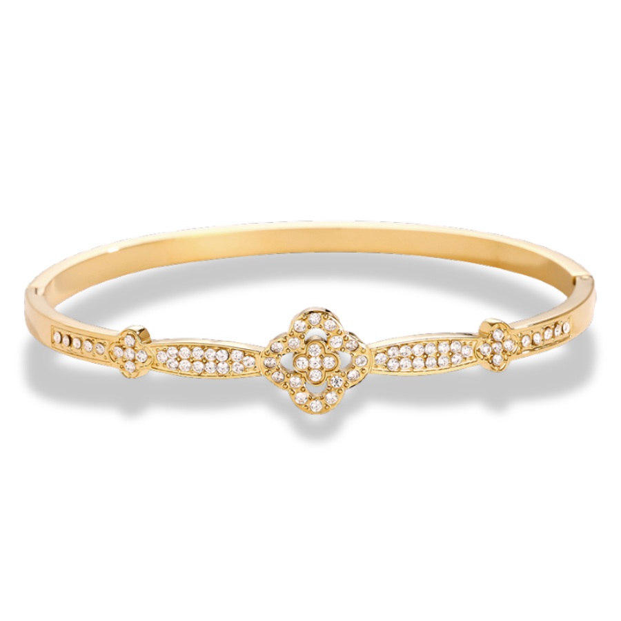Dieser edle Armreif vereint feminine Eleganz mit funkelnder Raffinesse. Die Vorderseite ist vollständig mit Zirkonia-Steinen besetzt und wird von einer doppelten, kleeblattförmigen Blüte im Mittelpunkt geziert, die im Pavé-Stil besonders intensiv funkelt. Ergänzt wird das Design durch zwei kleinere, kleeblattförmige Blüten auf der rechten und linken Seite, ebenfalls mit Zirkonia-Steinen besetzt.