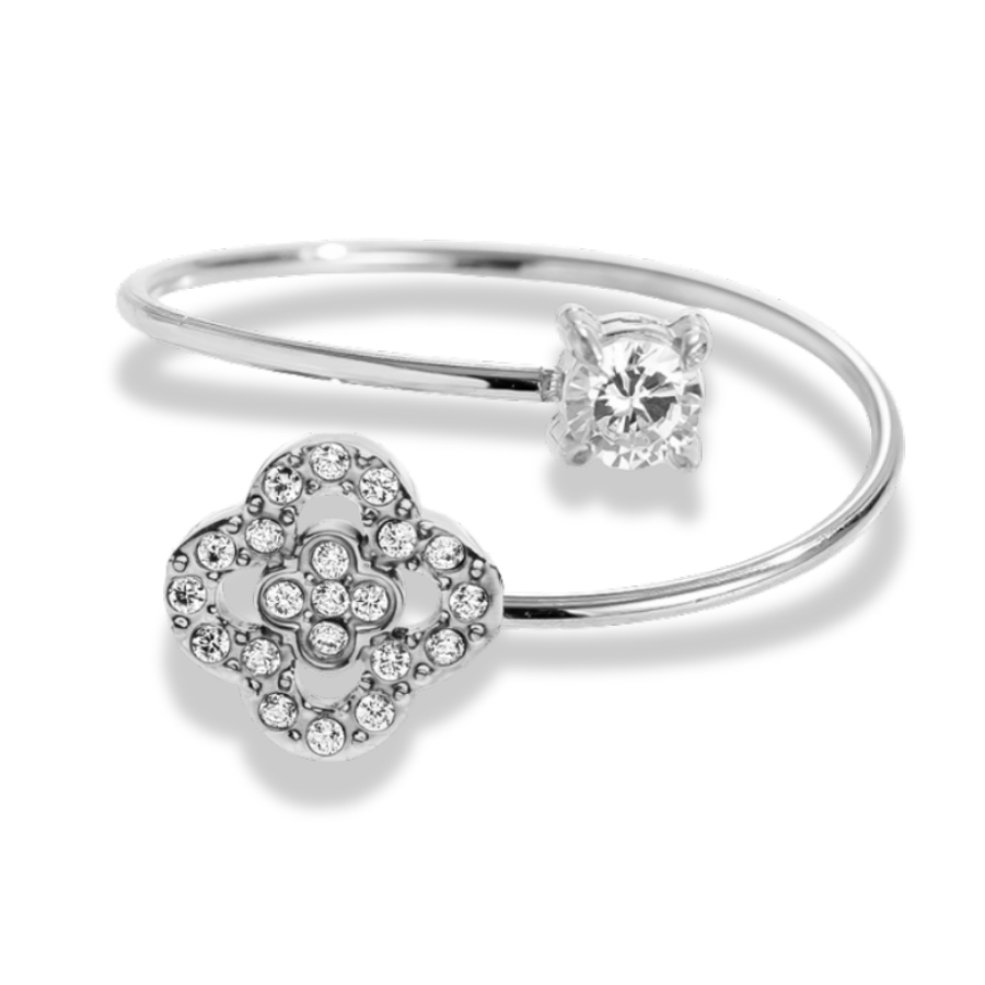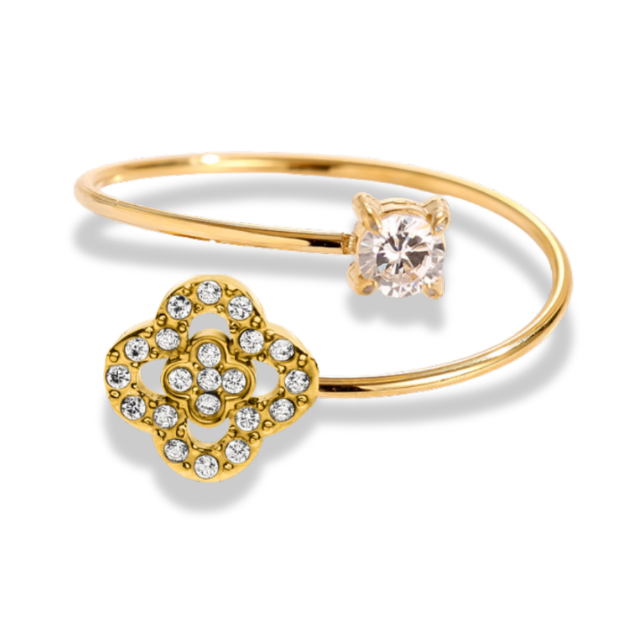 Dieser besondere Ring vereint filigranes Design mit funkelnder Eleganz. Die nach vorne offene Form wird an einem Ende von einer doppelten, kleeblattförmigen Blüte geziert, die vollständig mit Zirkonia-Steinen im Pave-Stil besetzt ist. Am gegenüberliegenden Ende setzt ein einzelner, funkelnder Zirkonia-Stein einen edlen Akzent und rundet das Design harmonisch ab.