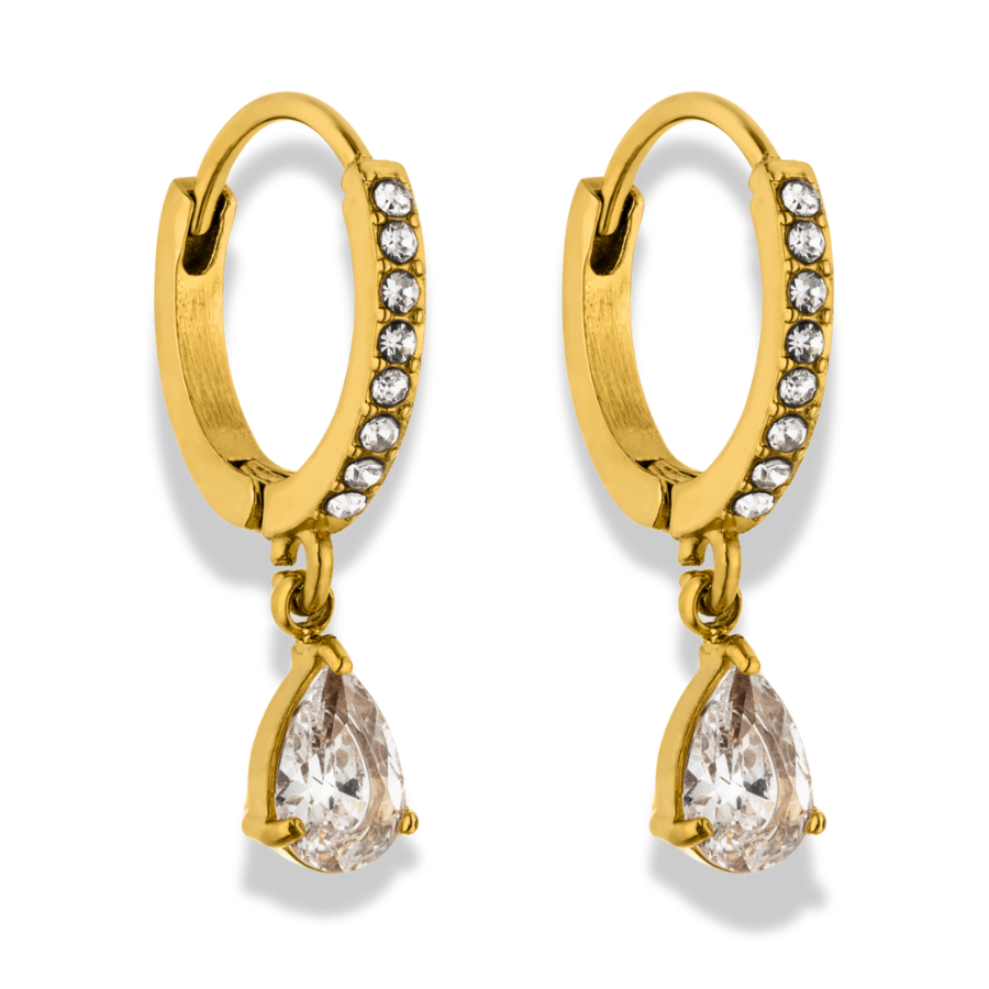 Ein femininer Eyecatcher, der klassische Huggie-Form und funkelnde Tropfenform harmonisch vereint: perfekt, um jedem Outfit einen Hauch von Eleganz zu verleihen.