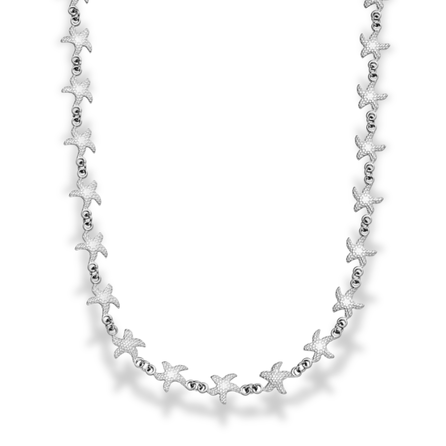 DieGolden Sea Star Kettebringt maritimen Zauber in ein elegantes Schmuckdesign. Bestehend aus einer Reihe kleiner, goldener Seesterne, die kunstvoll aneinandergereiht sind, verleiht sie jedem Look sommerliche Leichtigkeit und einen Hauch Ozean-Flair. Die feinen, typischen Erhebungen auf den Seesternen reflektieren das Licht aus allen Richtungen und erzeugen ein sanftes, funkelndes Spiel auf der Haut.