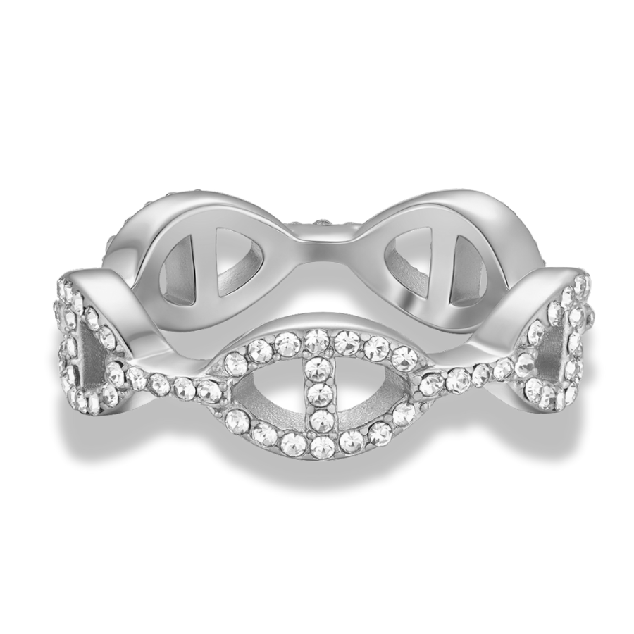 Strahlender Glanz trifft auf modernes Design. Der Pave Flow Deluxe Ring besticht durch seine außergewöhnliche Form und das funkelnde Zusammenspiel hochwertiger Zirkonia-Steine. Die elegante Silhouette erinnert an ein Unendlichkeitsmotiv mit luxuriöser Note und verleiht jedem Look einen edlen Akzent.