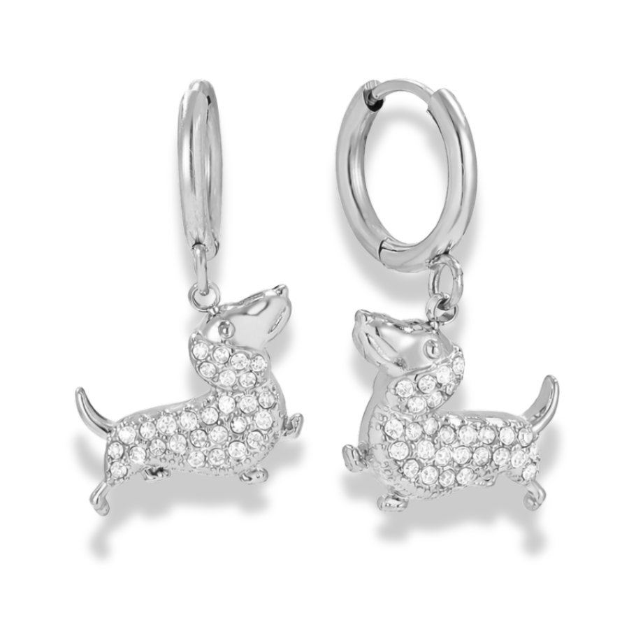 Diese verspielten Huggie Hoop Ohrringe sind eine Hommage an den besten Freund des Menschen. Die beliebten kleinen Creolen werden durch süße Dackel-Anhänger ergänzt, die mit funkelnden Zirkonia-Steinen im Pave-Stil besetzt sind. Ein detailreiches Design, das Charme, Persönlichkeit und Freude vereint.